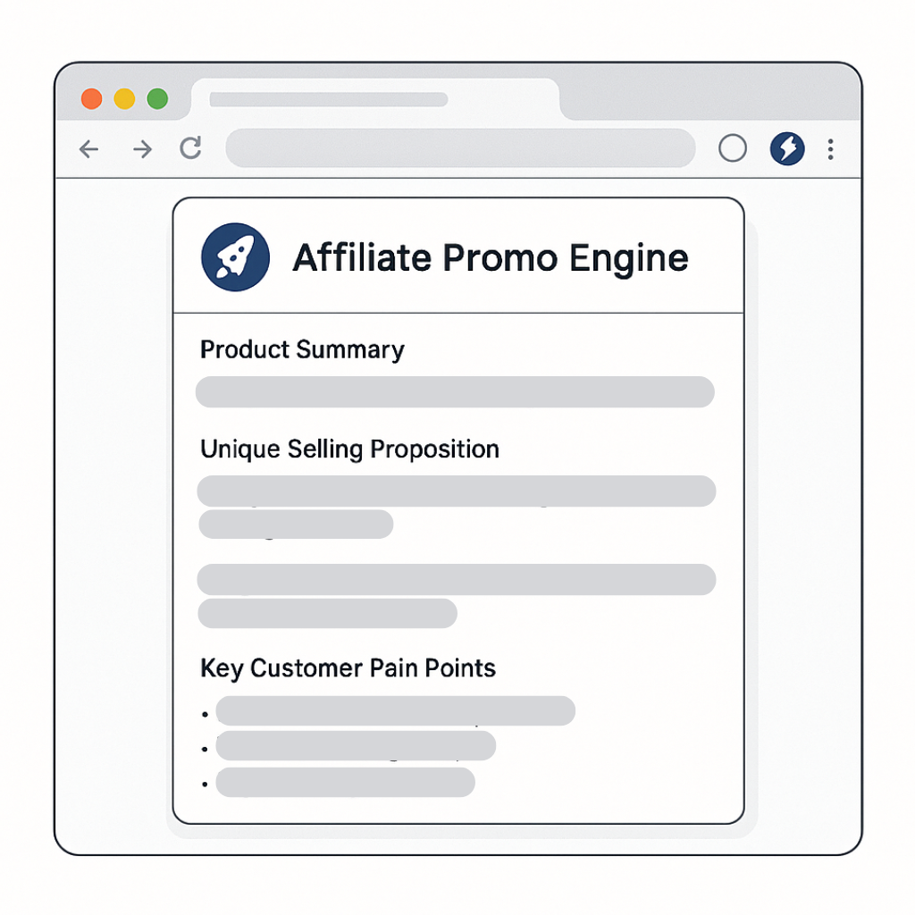 Affiliate Promo Engine is a lightweight Chrome extension that does all the heavy lifting for you. Powered by AI, it instantly generates a complete affiliate promo pack tailored to the exact product page you’re viewing.